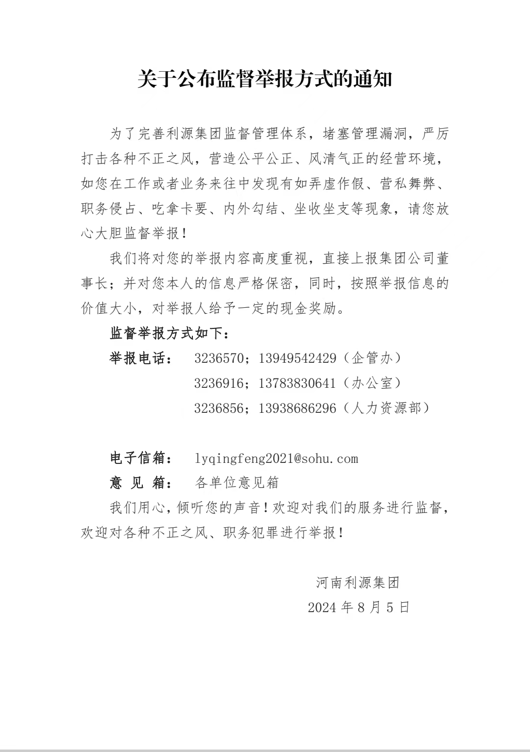 關(guān)于公布監(jiān)督舉報方式的通知